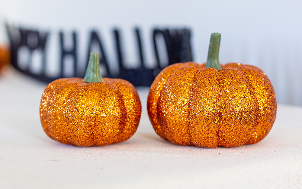Add some sparkle to your space with glitter pumpkins! Apply Mod Podge to the surface, sprinkle glitter generously and let dry. You can cover the whole pumpkin or just accent the top or bottom.
